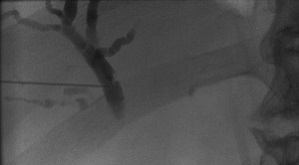 The needle was replaced with an AccuStick set over a guidewire through which a cholangiogram was repeated, revealing severe stricture of the distal right and left hepatic ducts as well as the common hepatic duct, Fig 2.