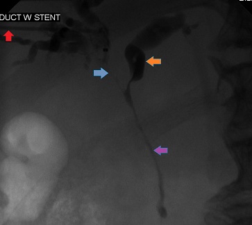 History: An 87-year-old man was admitted to a hospital because of jaundice. He was found to have conjugated and unconjugated hyperbilirubinemia, the former more than the latter. His cross-sectional imaging revealed marked dilation of his extra-hepatic and intra-hepatic bile ducts that proved inaccessible at endoscopic retrograde cholangiopancreatography (ERCP). He was referred to interventional radiology for percutaneous biliary drainage, where the decision was made to percutaneously drain the biliary tree.