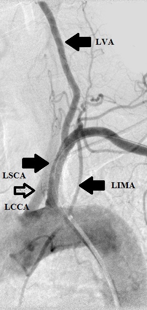 In vertebral-subclavian steal syndrome, because the increased demand for blood that attends active use of an upper extremity is not met due to critical stenosis or occlusion of the brachiocephalic trunk or the subclavian artery, blood is short-circuted from the ipsilateral vertebral artery reducing hindbrain perfusion. The patient may experience such hindbrain symptoms as dizziness, nausea, dyequilibrium and vomiting that improve by resting the limb. Similarly, in coronary-subclavian syndrome blood is shunted from the coronary artery to which the LIMA is grafted, causing coronary syndrome involving the short-changed myocardial territory that improves with resting the left upper limb.